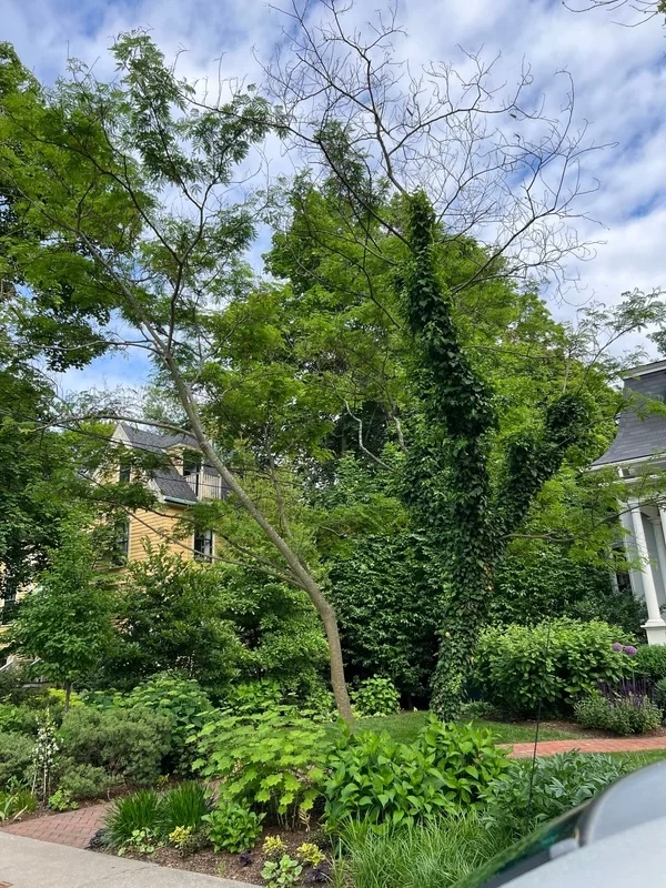 Cities are planting trees to absorb pollution. Locally, the problem is that the city and town landscaping departments aren’t aware that English Ivy, our local kudzu, is destroying more trees, most of them mature trees. The ivy strangles the trees and starves the trunks of rainwater. English Ivy is not the same ivy that we are used to seeing on college buildings, although the ivy somewhat resembles it as it grows stronger and the leaves grow larger as they climb the tree. On the ground, English Ivy usually has small, dull, dark green leaves, which tend to be shinier in the summer.